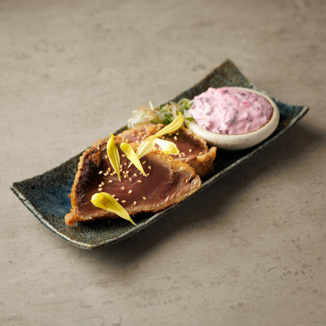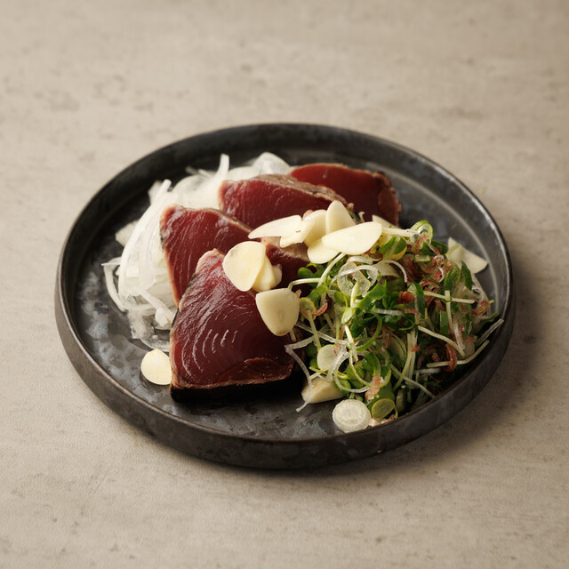 束ねた藁に火をつけ、大きく燃え上がった炎で鰹の表面を炙って仕上げる産地直送、高知県産の初鰹を使用した『鰹の藁焼き』は当店の看板メニューです。ライブ感抜群のカウンター席で圧巻のパフォーマンスをお愉しみください。品切れ続出のメニューでございますので、お早めのご注文をお願いいたします。