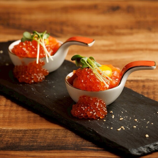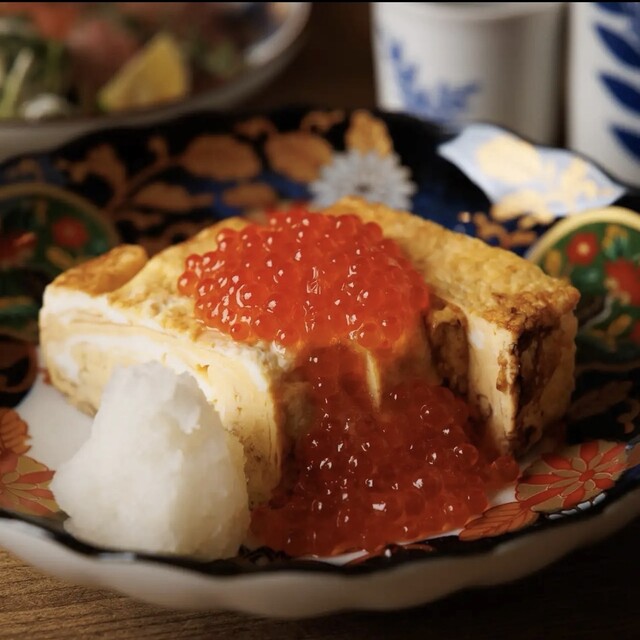 うらめし屋を語る上で欠かせないのがこの「溢れいくらの出汁巻」。お客様の目の前で出来たて熱々の出汁巻に溢れんばかりのいくらを乗せさせていただくパフォーマンスは圧巻です。SNS映えは必至、動画やお写真を撮って良し、食べて良しの二度楽しめる逸品となっております。品切れ続出のメニューでございますので、お早めのご注文をお願いいたします。